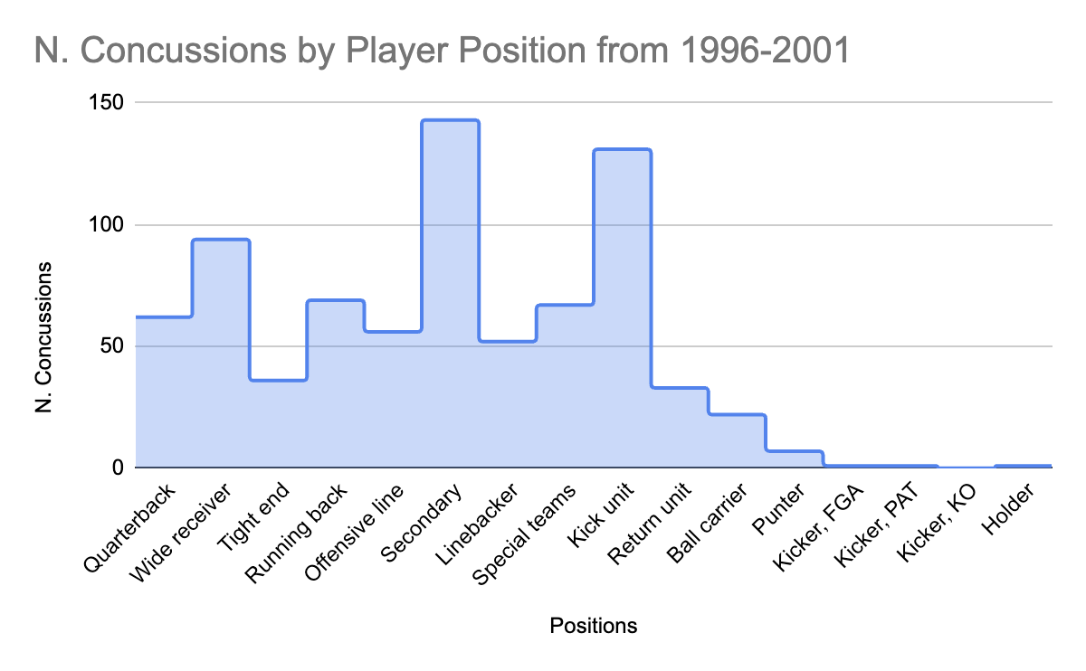 Here we can see the majority of concussions sustained are by the Secondary, Kick Unit, and Wide Receivers.